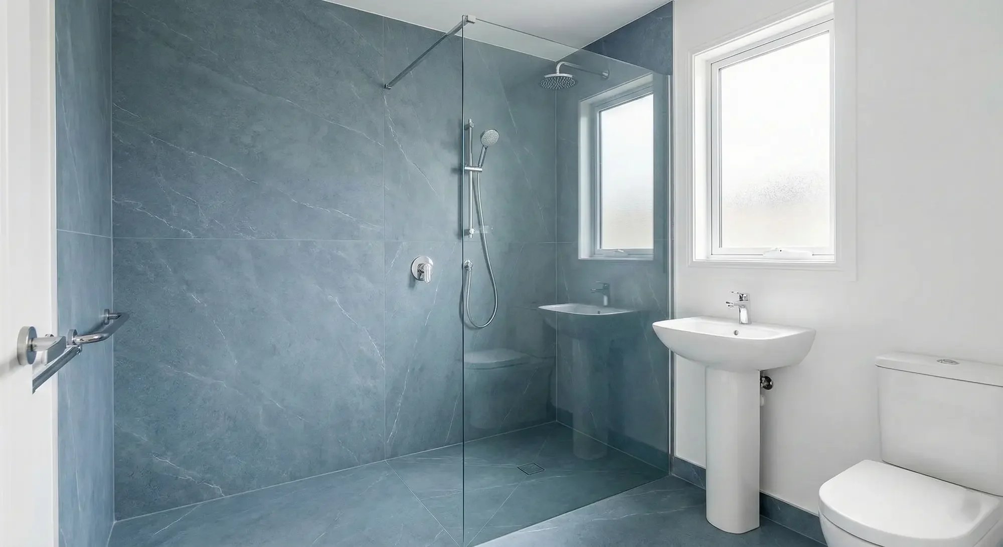 We install large-format porcelain slabs with zero grout lines. Our grout-free showers are non-porous, wipe-clean, and physically impossible for mold to colonize.